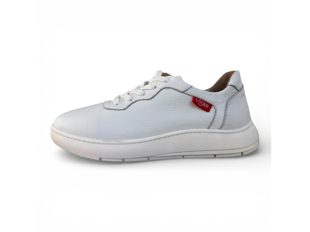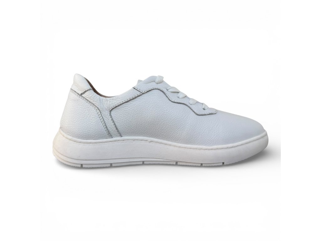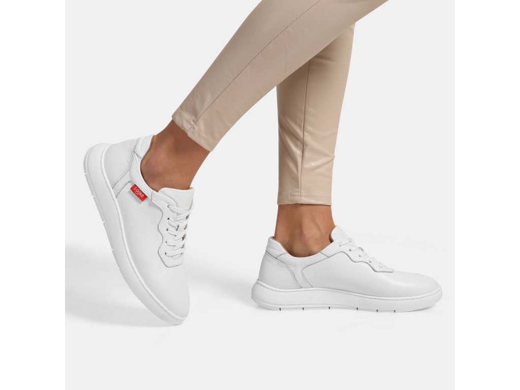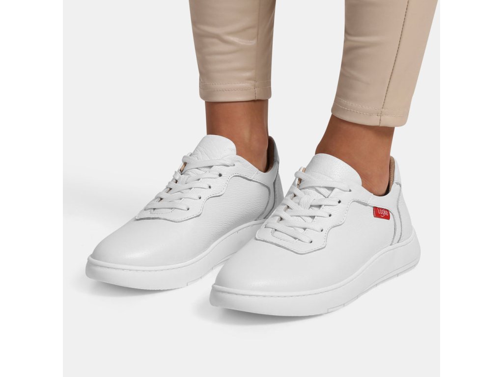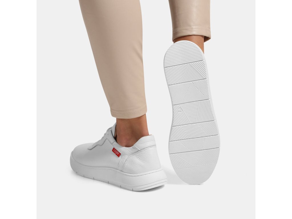 Dámské bílé pohodlné tenisky z pravé texturované kůže. Odolná lehká podešev a červené logo na straně.